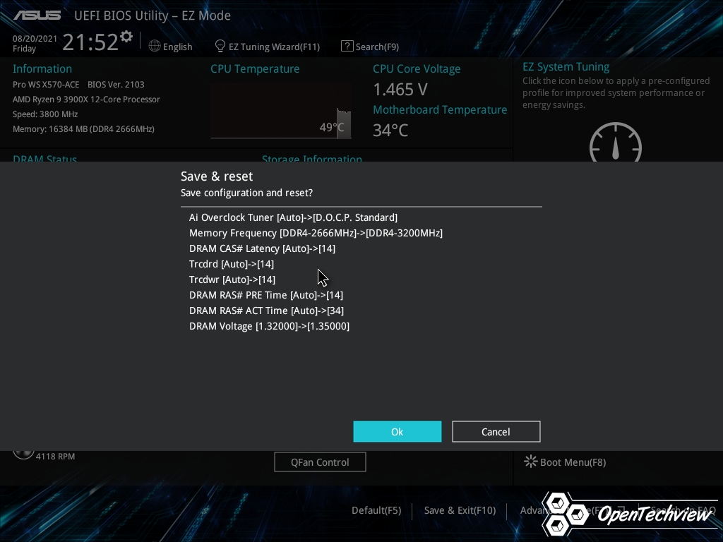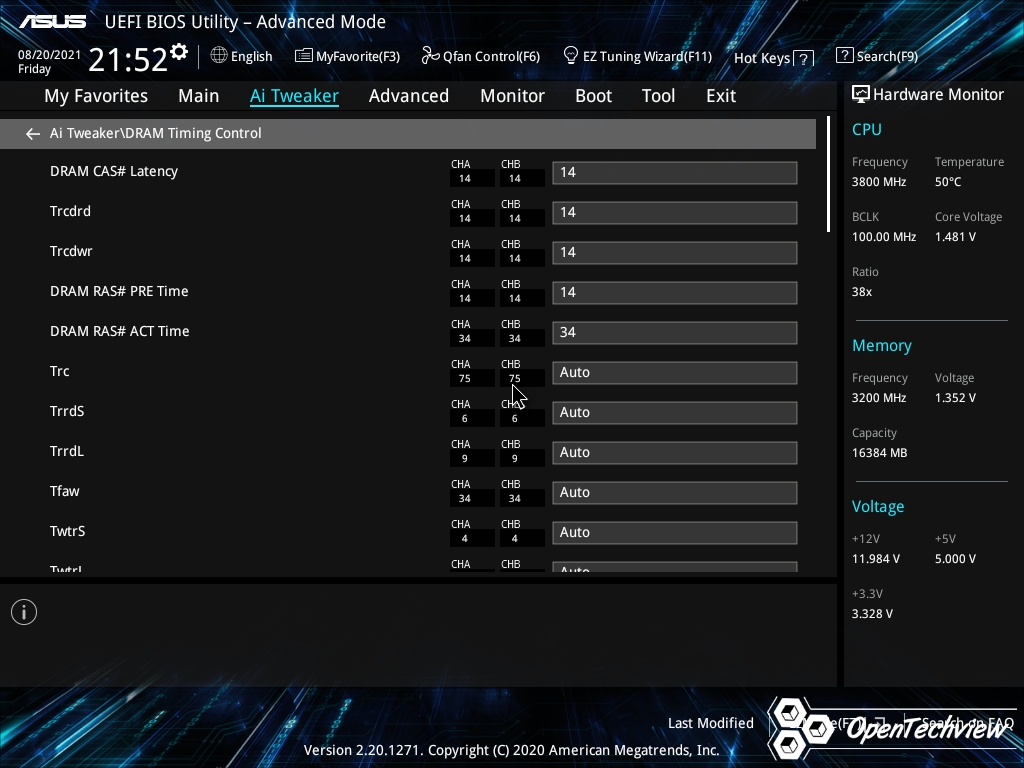 동작클럭 3200MHz , 타이밍 CL14-14-14-34, 전압 1.35V로 설정된 모습입니다.