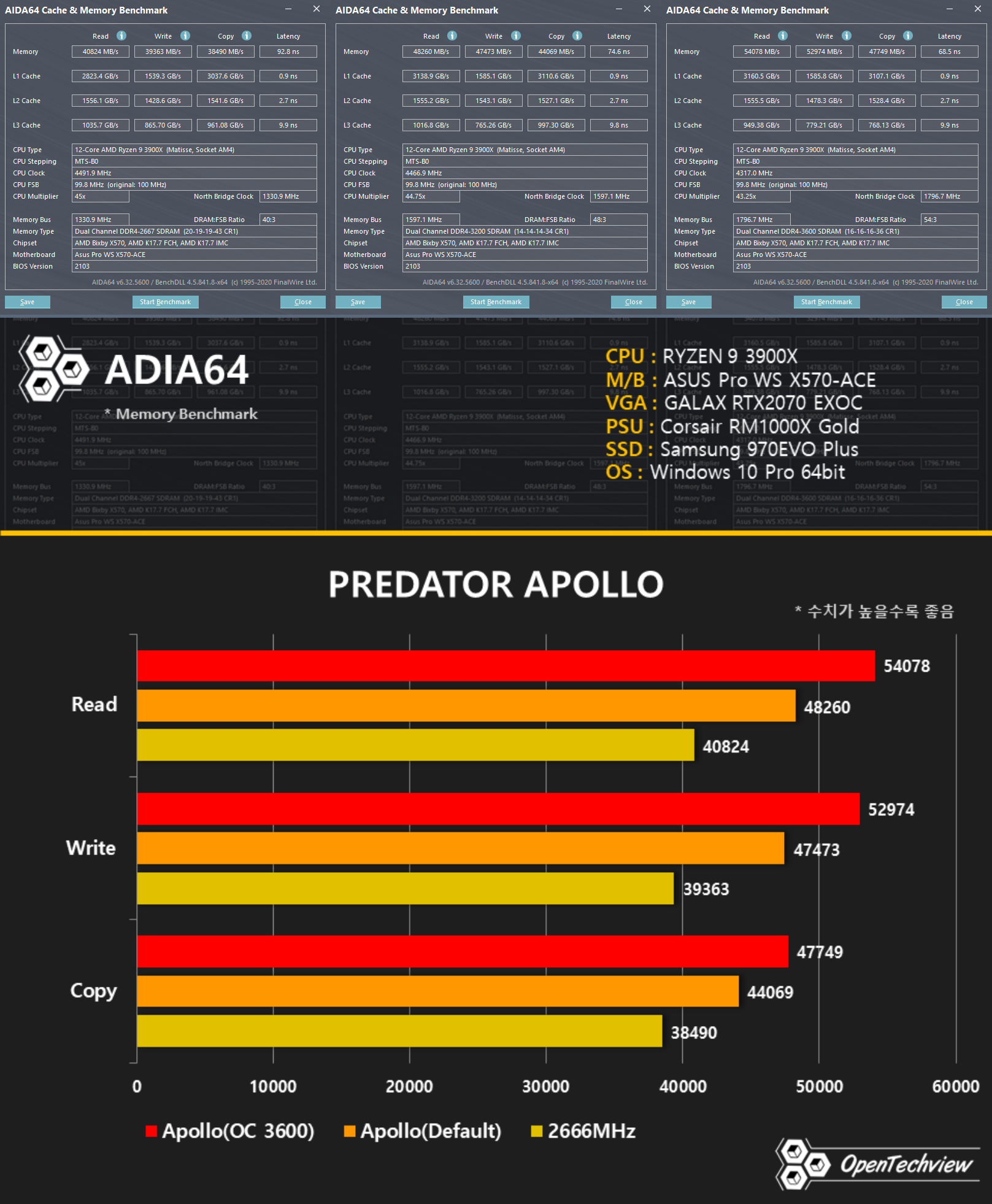읽기, 쓰기, 복사 전 영역에서 2666MHz 번들램대비 빠른 처리속도를 기록했으며 오버클럭 설정된 에이서 프레데터 APOLLO 튜닝램의 경우 많게는 32%가량 빠른 처리속도를 보여줬습니다.