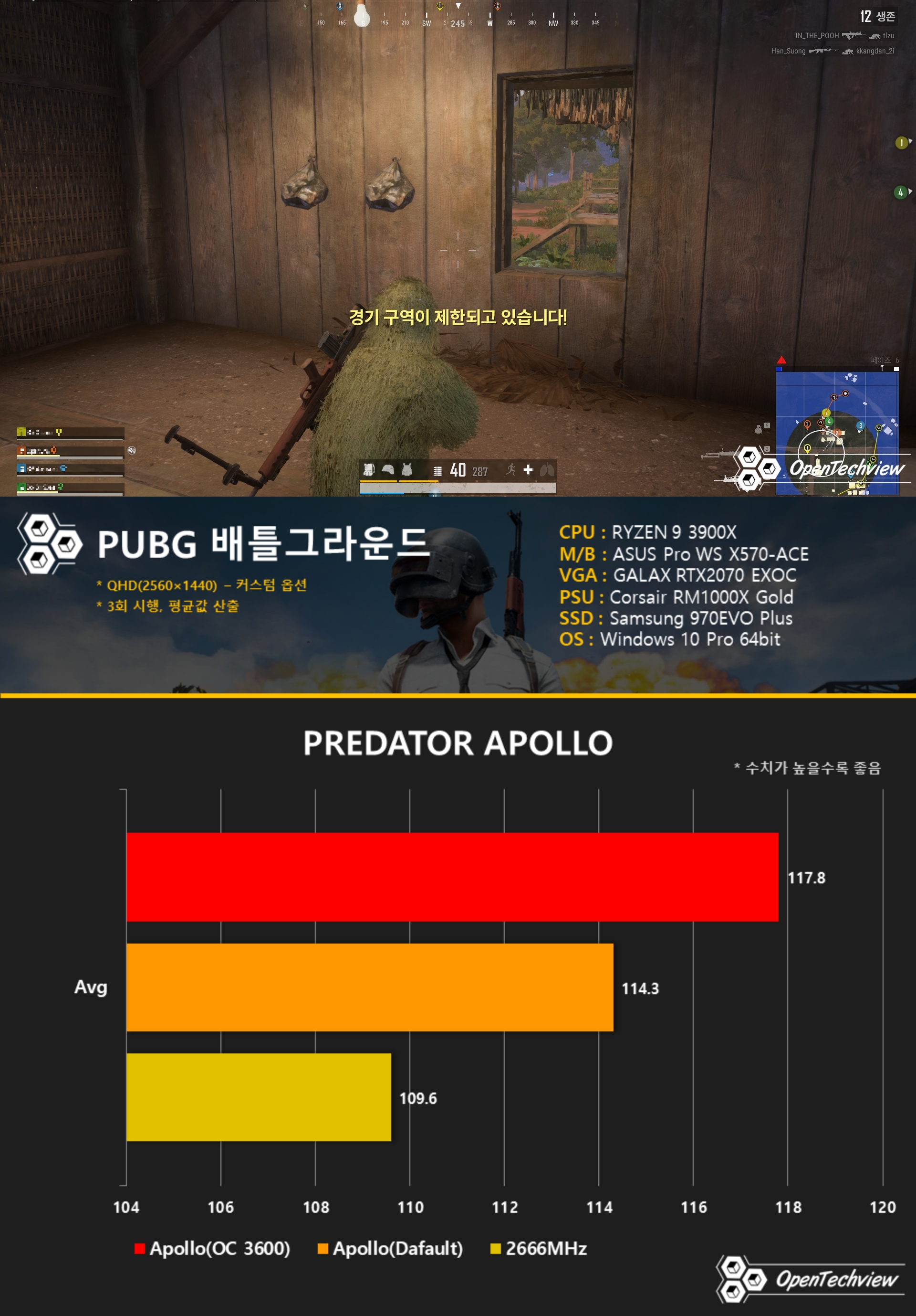 번들램 대비 에이서 프레데터 APOLLO 튜닝램으로 테스트한 평균 프레임이 5프레임에서 많게는 9프레임가량 높게 측정되었습니다.
