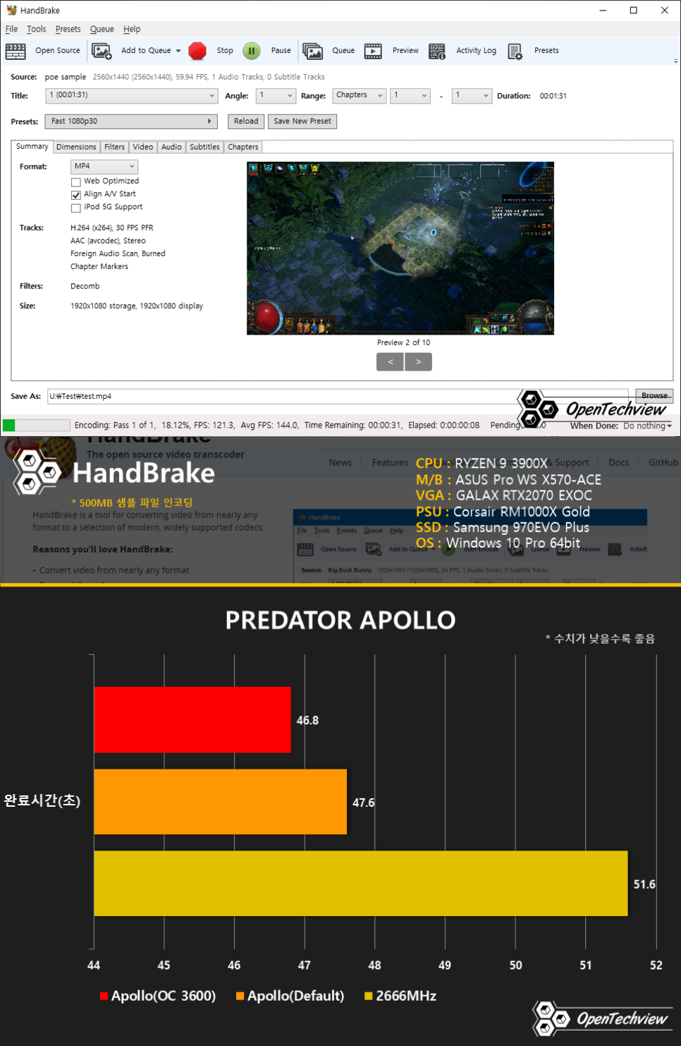 500MB 샘플 파일을 인코딩하였으며 번들램의 경우 51.6초, 오버클럭 설정된 에이서 프레데터 APOLLO 튜닝램의 경우 46.8초로 약 10%가량 빠른 처리속도를 보여줬습니다.
