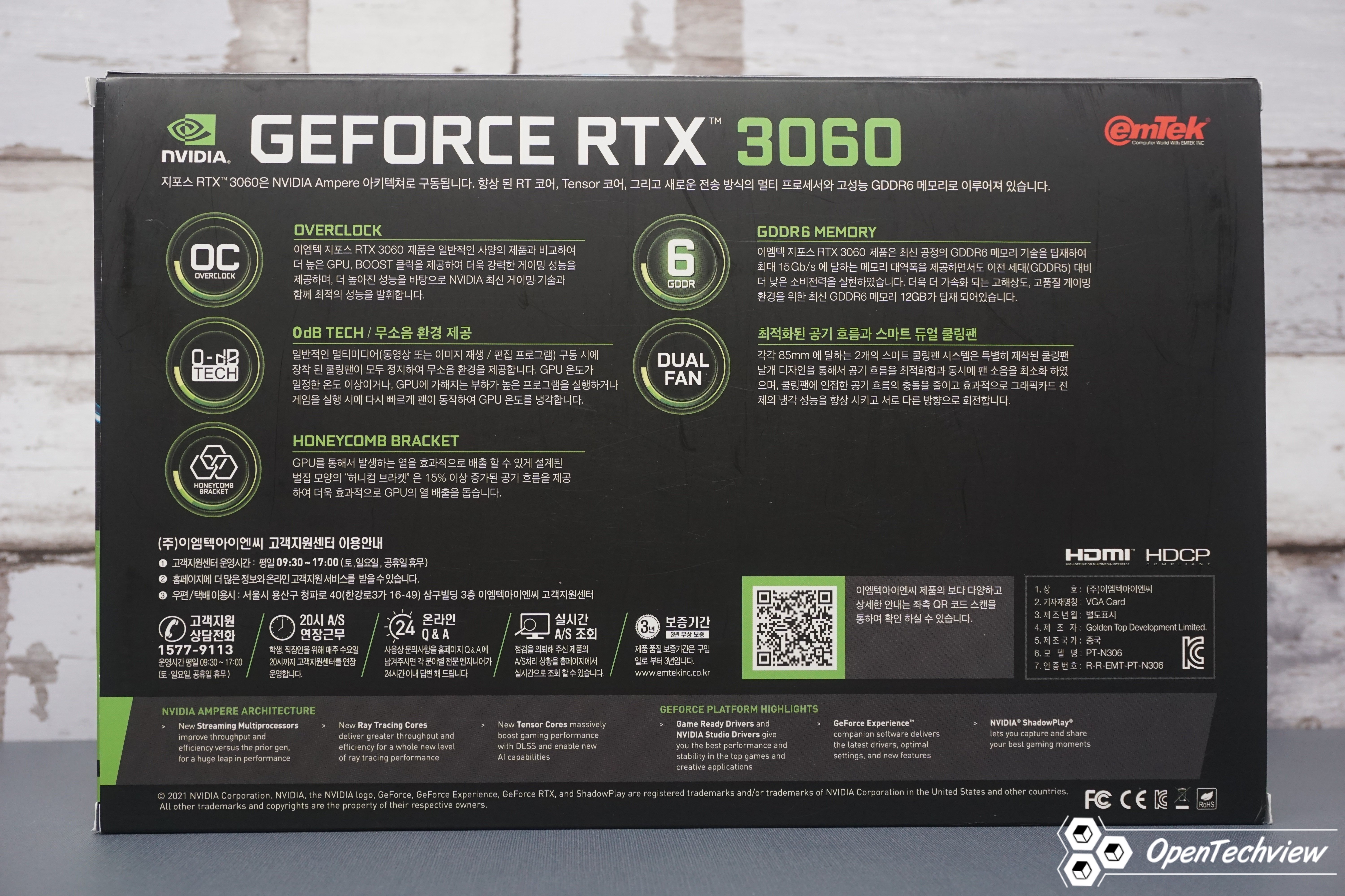 패키지박스엔 크게 OC 모델, 메모리 용량, RGB와 같이 제품의 큰 특징들과 RTX3060 칩셋의 기능들이 간략하게 표현되었습니다.