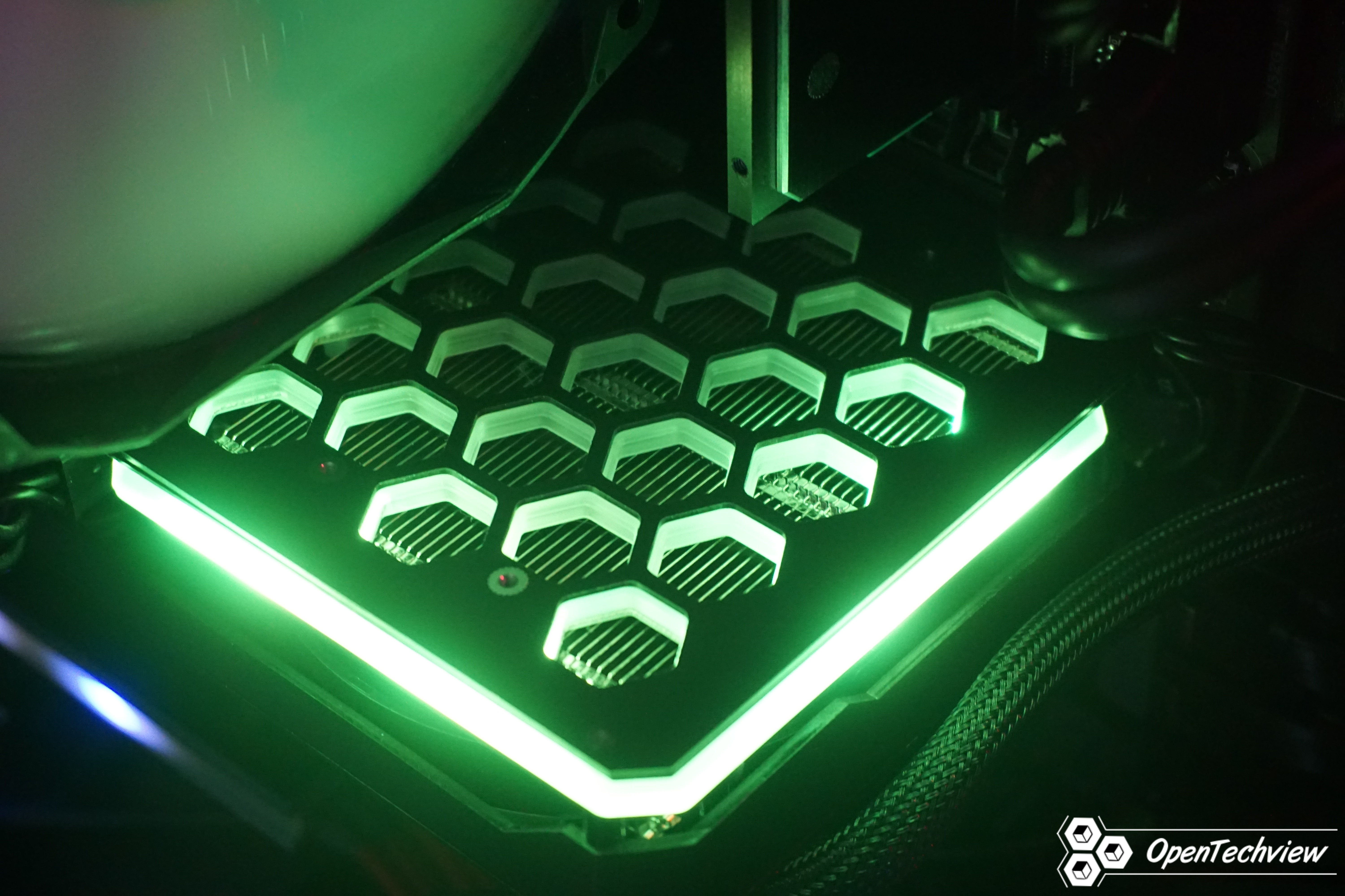 허니콤 디자인 타공홀 영역은 LED를 끈 상태에서도 포인트 요소로 둘만한 모습을 보여줬으며 CPU쿨러의 팬이 흰색이라 그런지 조화를 잘 이루는 느낌을 받았습니다.