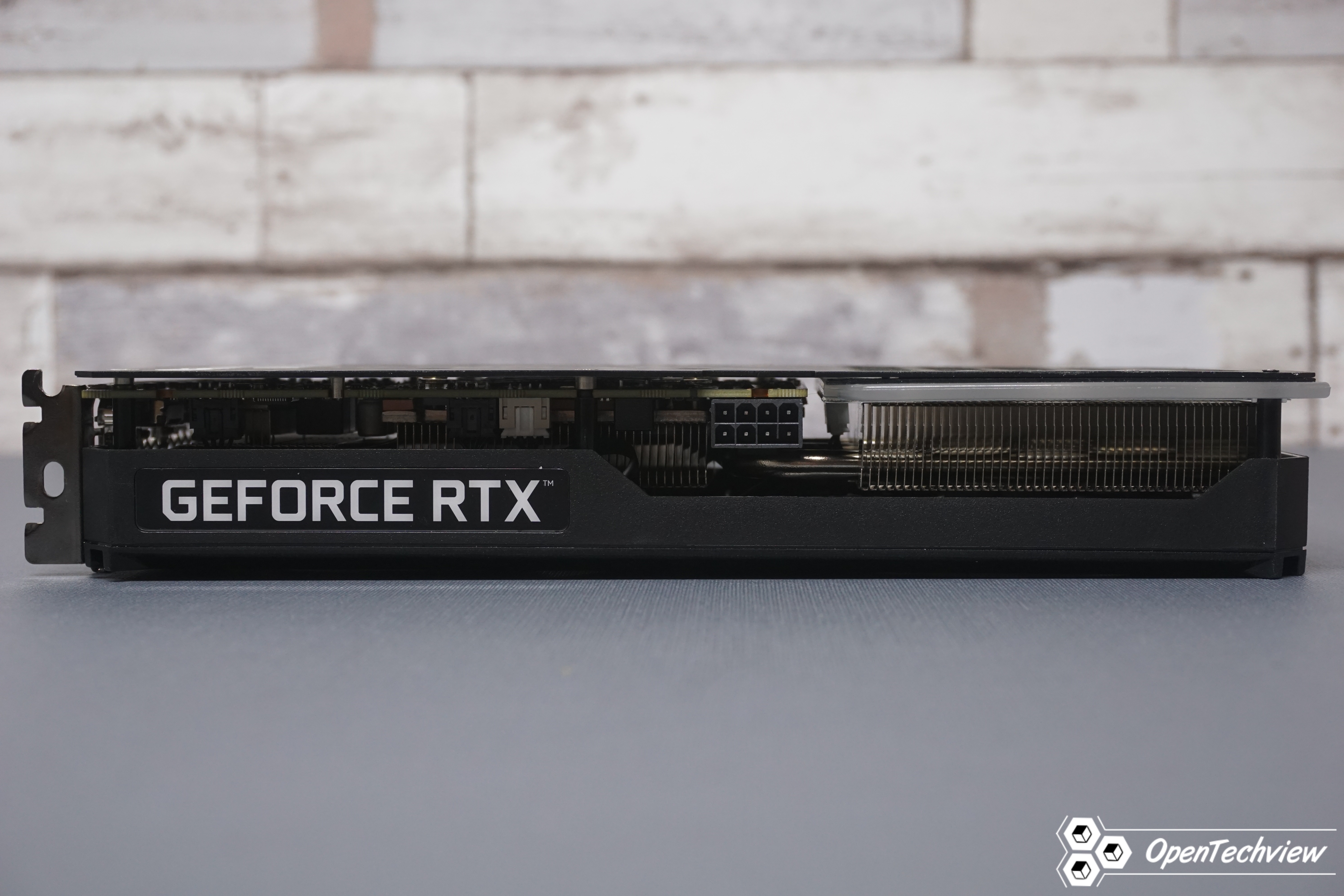 이엠텍 지포스 RTX 3060 STORM X Dual OC D6 12GB의 두께는 PCI 2슬롯에 가까운 두께며 측면에서 확인할 수 있듯이 PCB가 차지하는 영역은 좌측부터 보조전원까지입니다.