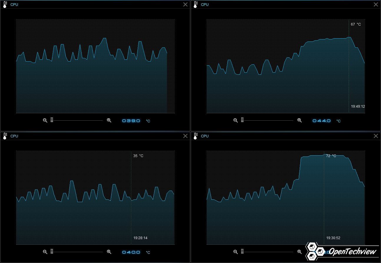 Fractal Design의 Torrent Compact 케이스(180mm팬 2개, 후면팬 1개)와 J사 미들타워 케이스(후면팬 1개, 상단팬 2개, 하단팬 3개 )를 동일한 시스템에서 벤치마크를 진행해봤습니다.