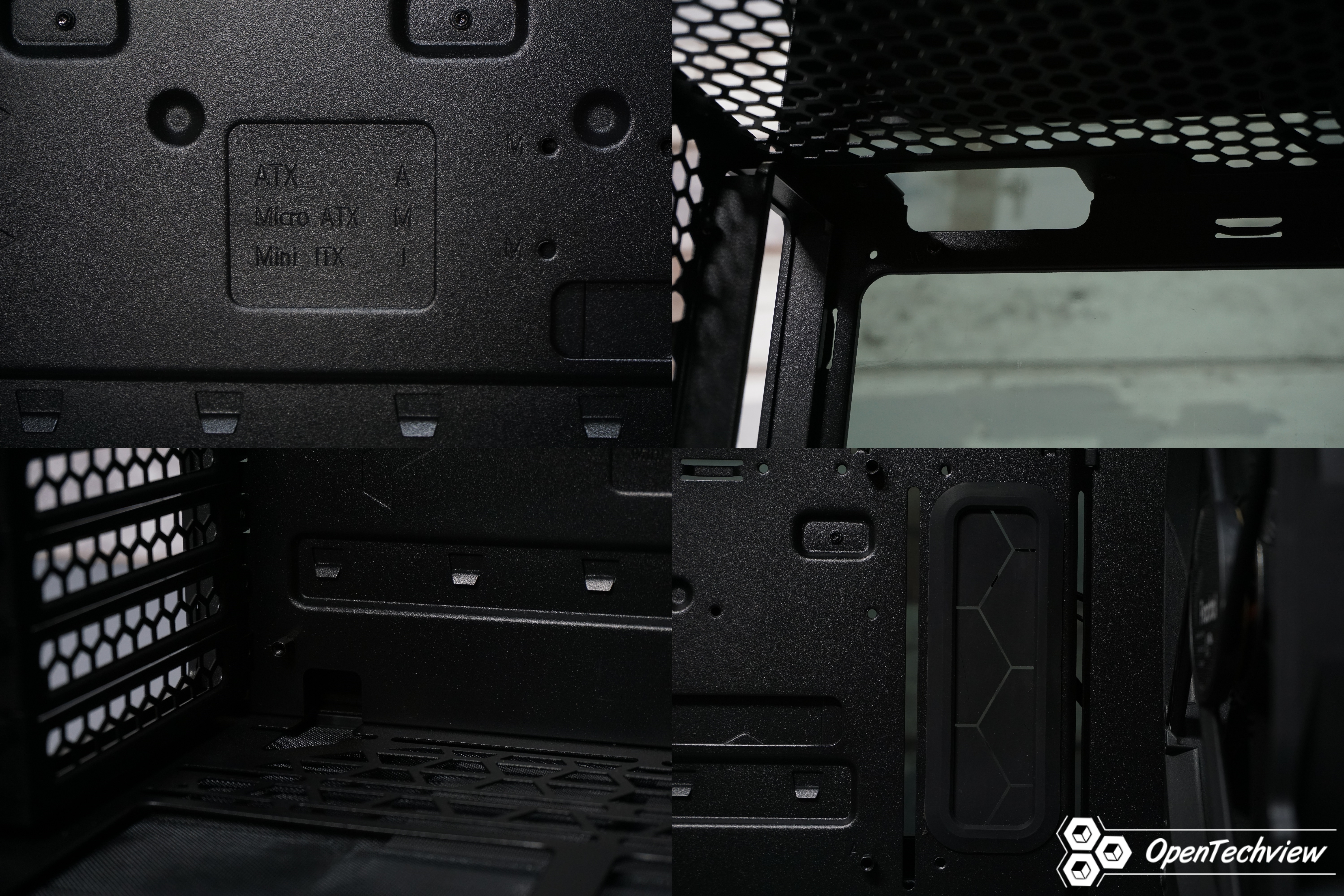 PCI브라켓은 공기흐름을 고려하여 벌집모양으로 타공처리되었으며 가이드라인이 없는 총 7열 PCI 브라켓을 지원함으로서 ATX 마더보드 폼팩터에 완벽히 지원하며 E-ATX 폼팩터 일부를 지원합니다.