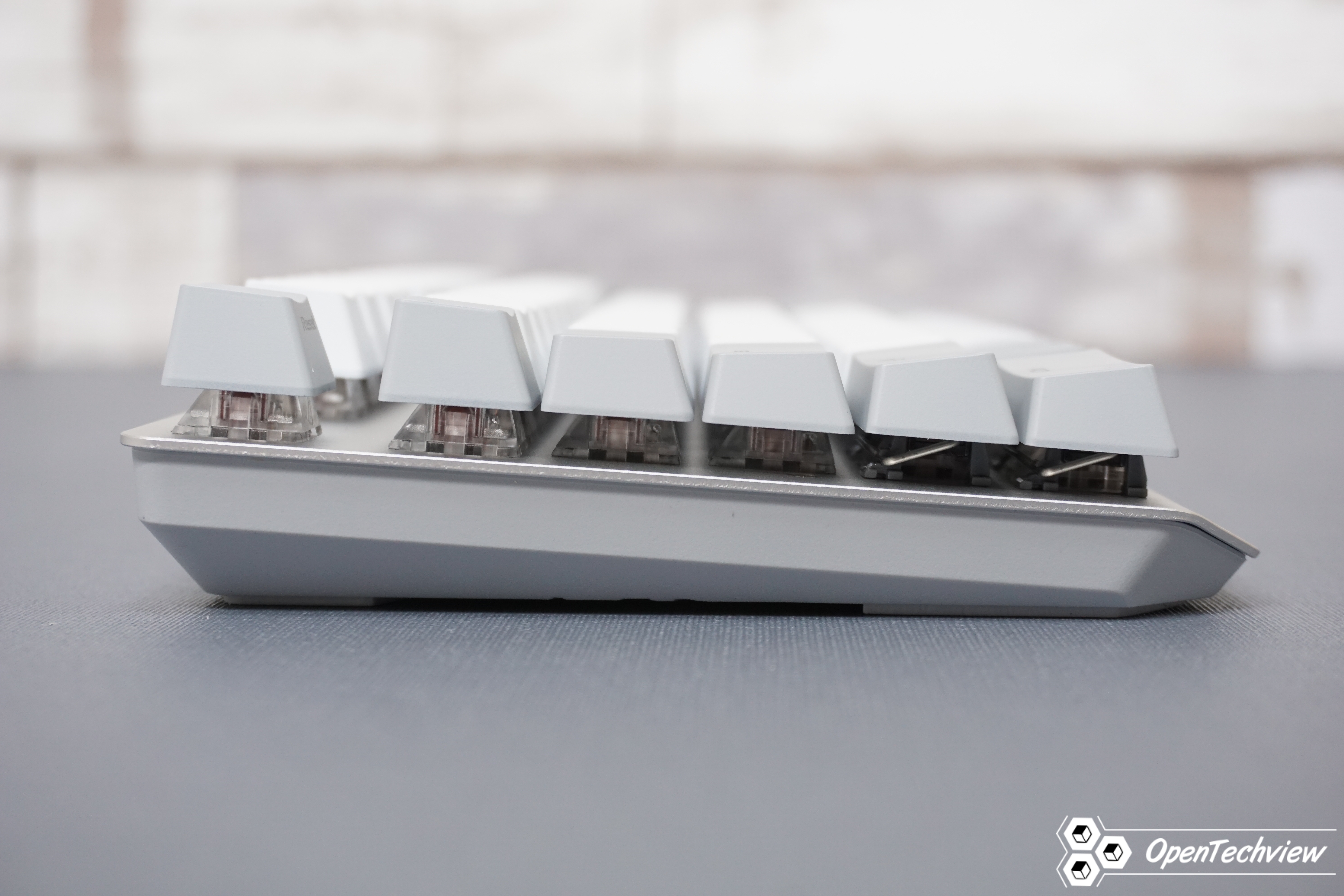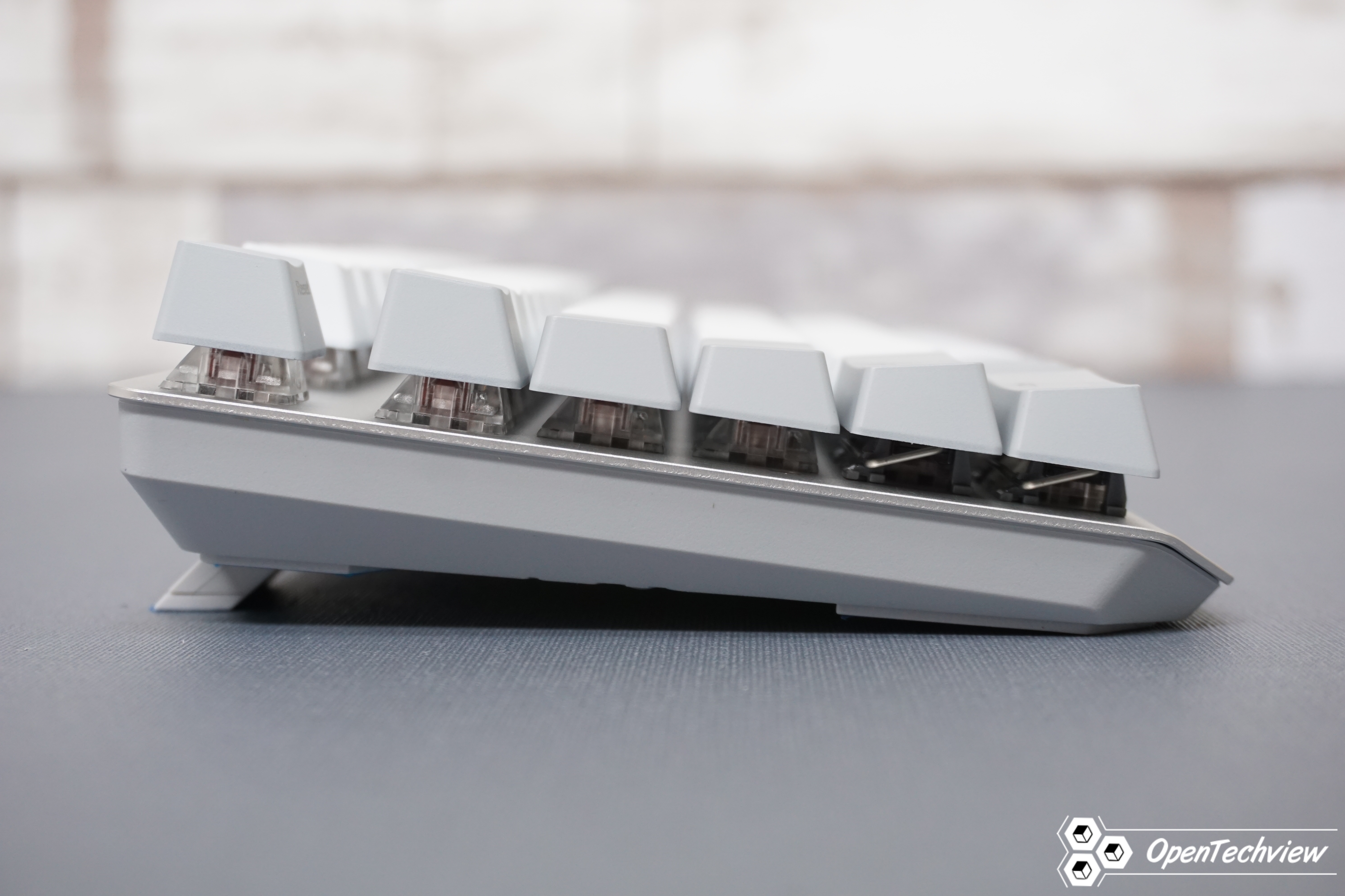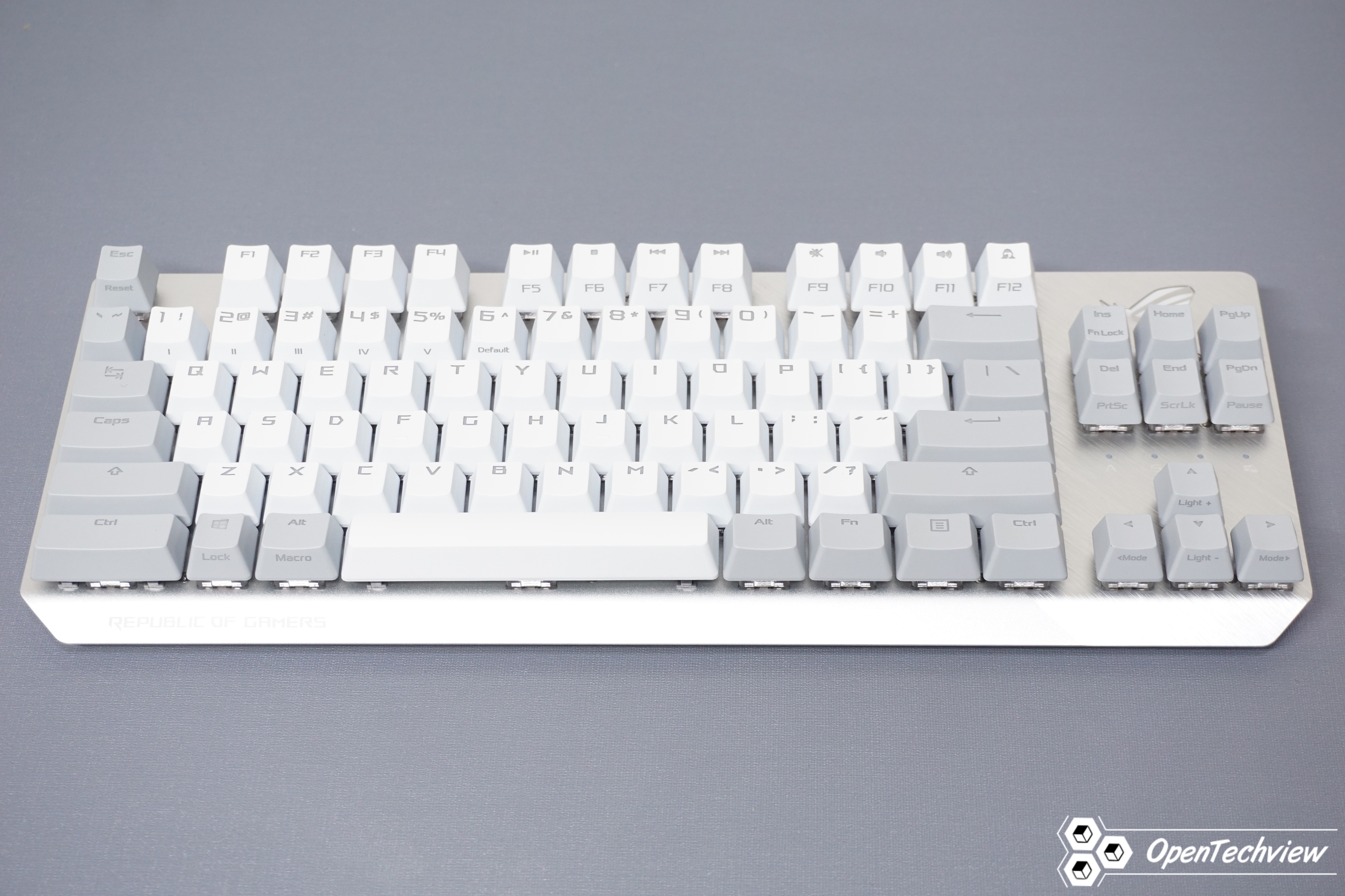 제품명에서도 유추할 수 있듯이 밝은 회색, 흰색 투톤 키캡과 알루미늄 상판까지 전반적으로 밝은 톤으로 디자인 되었습니다. 키보드의 레이아웃은 텐키리스(비키타입)로 꾸려졌으며 풀배열 키보드 대비 마우스의 드래그 영역을 넓게 가져갈 수 있는 장점이 있습니다. DPI를 낮게 사용하여 마우스의 드래그 범위가 넓은 사용자에게 적합한 키보드 레이아웃이라고 볼 수 있습니다.